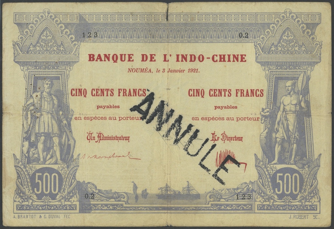 Banque de l'Indo-Chine, New Caledonia, 500 francs, 3 January 1921, serial number 0.2-123, blue and white, red text, male figure at left, indigenous male at right, printed signatures of Monplanet and de la Chaume