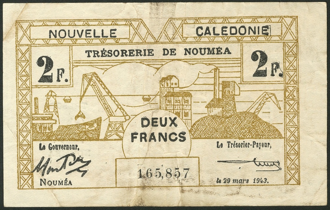 Tresorerie de Noumea, Bon de Caisse, New Caledonia, a group comprising 50 centimes, green and 1 franc (2), purple, 15 July 1942, 50 centimes (2), grey-green, 1 franc (2), blue, 2 francs (2), brown and 20 francs, red, all March/April 1943 and 5 francs (3), 15 June 1943, green, all mining scenes, reverse deer and cross of Lorraine at centre