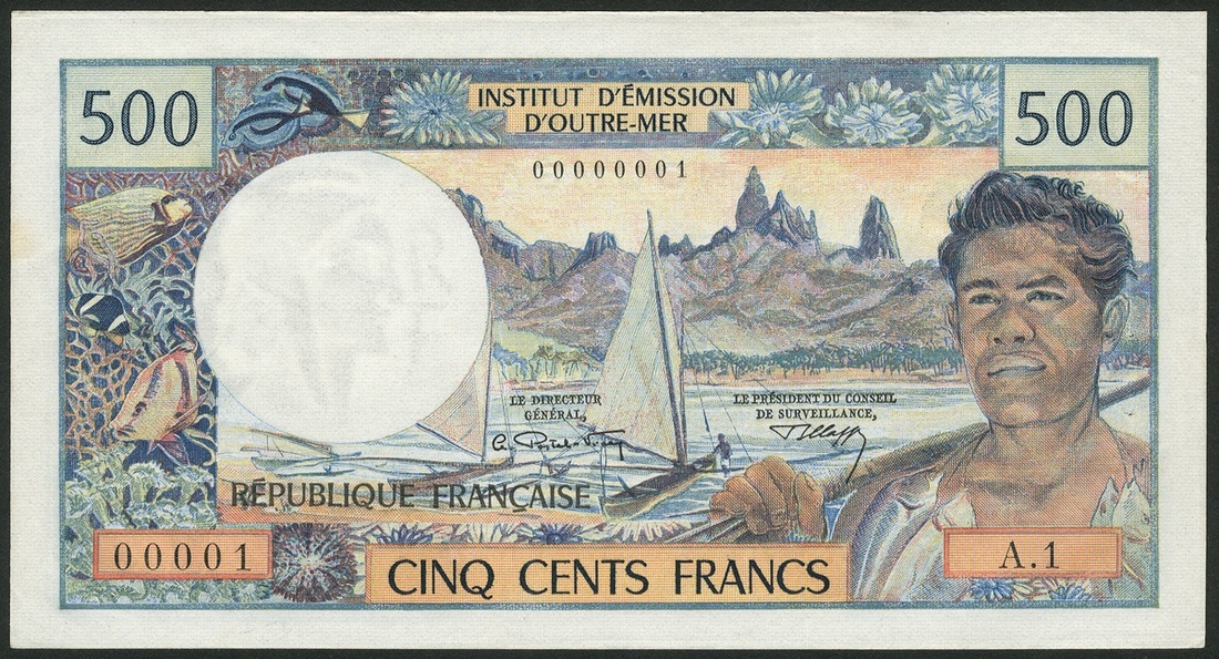 Institut d'Emission d' Outre-Mer, New Caledonia, 500 francs, ND (1970) , serial number A.1 000001, blue and multicoloured, fish in border, local man at right, canoe at centre, Postel-Vinay and Clappier signatures, reverse man at left, rock and beach and indigenous objects