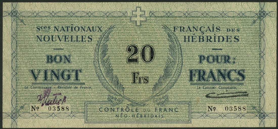 Services Nationaux Francais des Nouvelles Hebrides, 5 francs, ND (1943), serial number 04546, and 20 francs, ND (1943), serial number 03588, both blue text on green, handstamped signature low left and right, value, wreath and Cross of Lorraine at centre