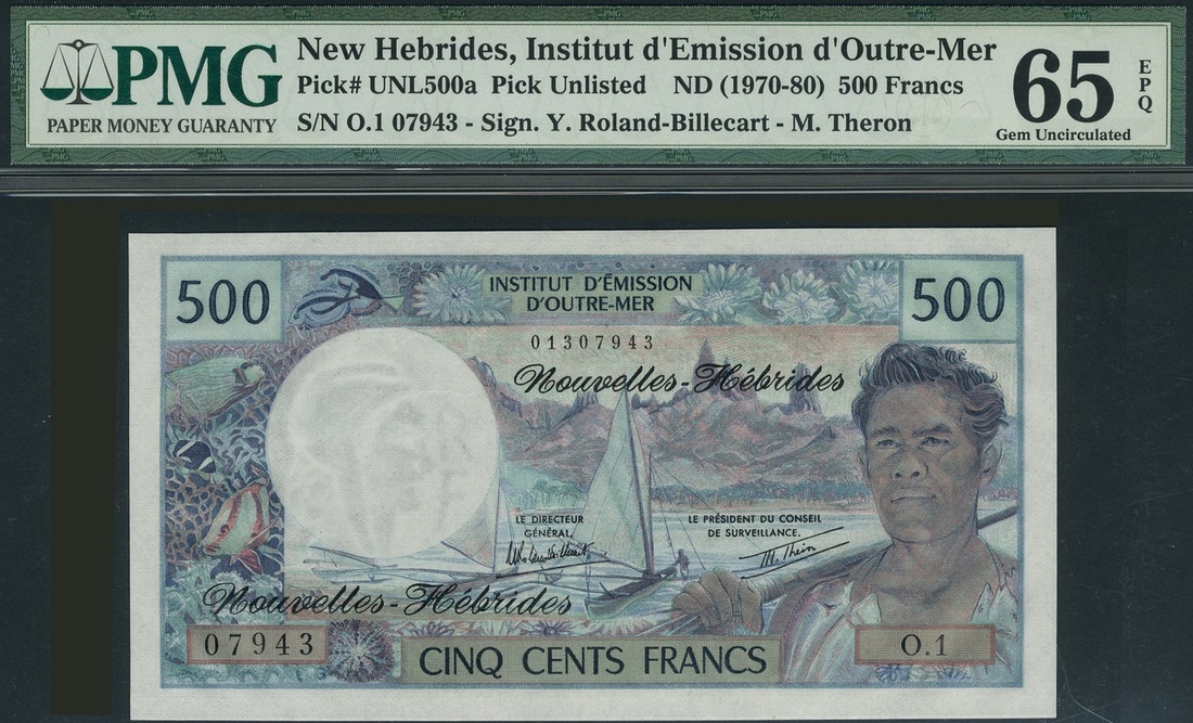 (x) Institut d'Emission d'Outre-Mer, New Hebrides, 500 francs (2), ND (1970-1980), serial number O.1 07943/44, blue, fisherman and boat, Roland-Billecart and Theron signatures, also Martinique 5 francs, ND (1947-1949), prefix P.21, blue