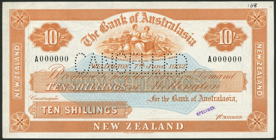 (†) Bank of Australasia, New Zealand, specimen 10 shillings, Wellington, 7 June 1932, serial number A 000000, orange and white with a pale blue central panel, allegorical maidens top centre