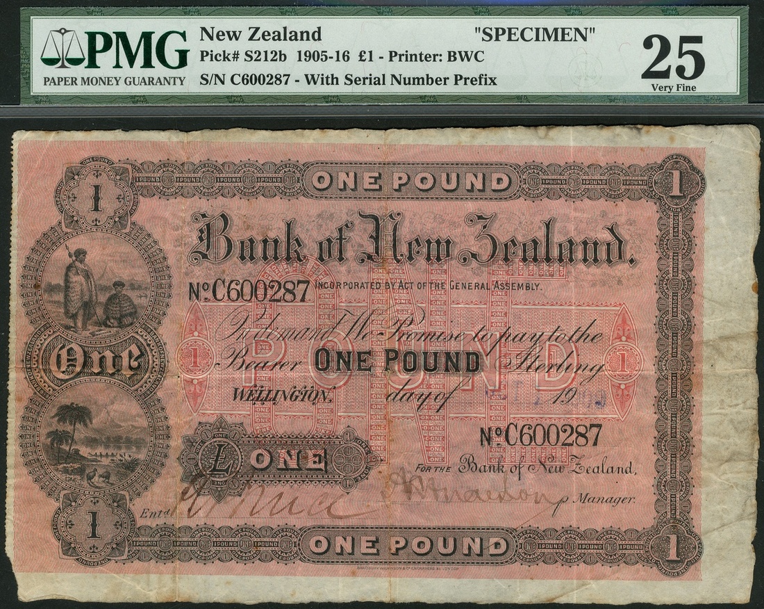 (x) Bank of New Zealand, £1, Wellington, red handstamped date 1 October 1909, serial number C600287, black on red underprint, two Maoris at top left, Kiwi birds at low left, value at low centre and each corner, two manuscript signatures below, reverse brown, arms at centre, landscape at left, Maoris at right