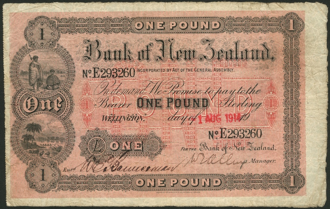 Bank of New Zealand, £1, Wellington, red handstamped date 1 AUG 1914, serial number E293260, black on red underprint, two Maoris at top left, Kiwi birds at low left, value at low centre and each corner, two manuscript signatures below, reverse brown, arms at centre, landscape at left, Maoris at right