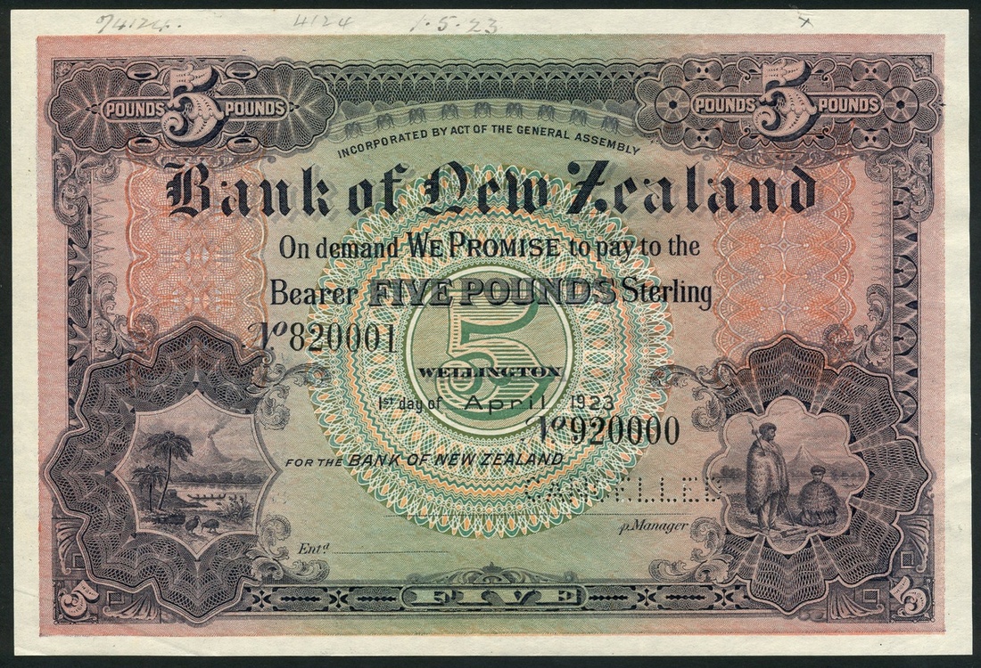 (†) Bank of New Zealand, specimen £5, Wellington, 1 April 1923, serial number 820001-920000, purple and multicoloured, allegorical scene low left and right, value in green underprint at centre, reverse blue, green and orange, arms top centre, value at each corner