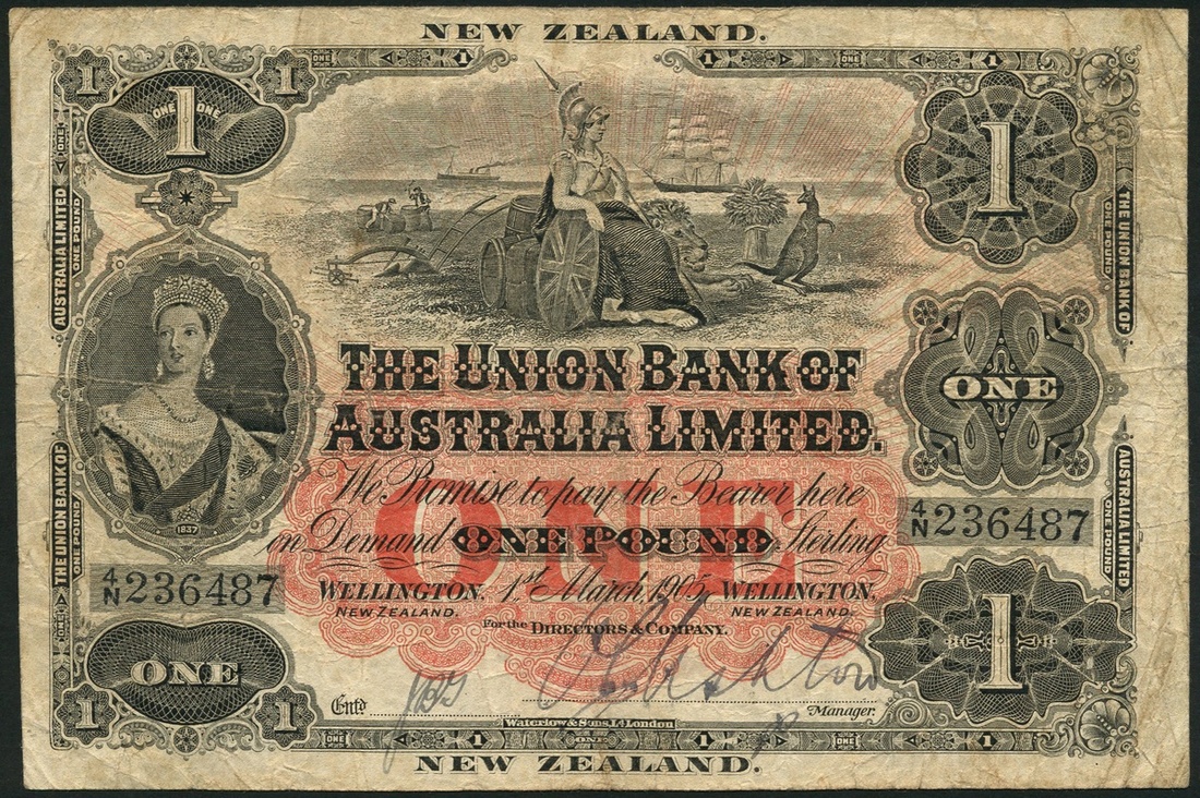 Union Bank of Australia Limited, New Zealand, £1, 1 March 1905, serial number 4/N 236487, black and white, value in pale red guilloche at centre, the Chalon portrait of Queen Victoria at left, Brittania at centre with symbols of prosperity, two manuscript signatures below, NEW ZEALAND above and below, reverse green, arms and value