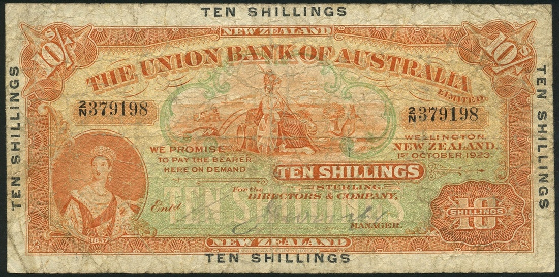 Union Bank of Australia Limited, New Zealand, 10 shillings, Wellington, 1 October 1923, serial number 2/N 379198, orange and pale green, Britannia seated top centre, the Chalon portrait of Queen Victoria low left, two manuscript signatures below, black TEN SHILLINGS in margins, reverse orange-brown, arms and value