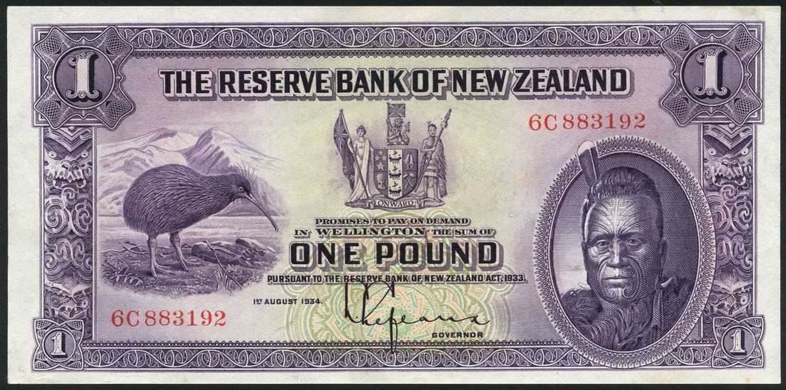 Reserve Bank of New Zealand, £1, Wellington, 1 August 1934, red serial number 6C 883192, purple, pale green and pink, the Maori King Tawhiao at right, Kiwi bird at left, arms top centre, printed signature of Lefeaux, purple and pale green, Milford Sound at centre, value at left and right