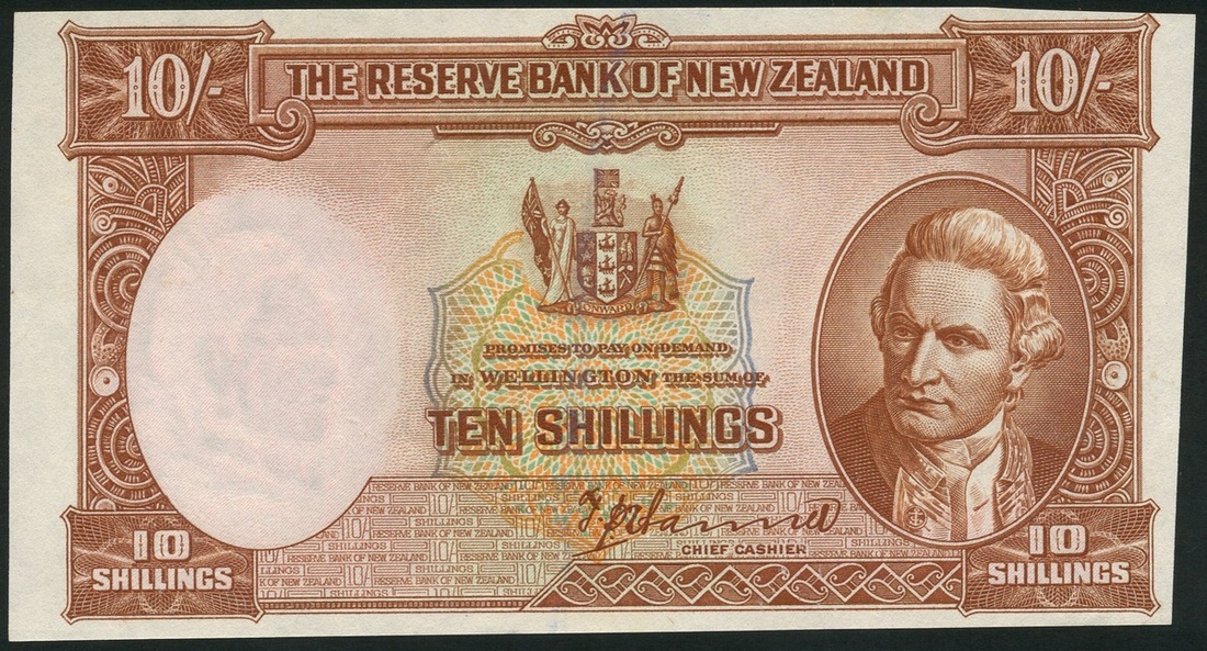 (x) Reserve Bank of New Zealand, an unissued 10 shillings, ND (1940-), no serial numbers, brown and pale pink, blue and green, Captain Cook at right, arms at centre, Hanna signature, reverse brown, Kiwi at left, the Treaty of Waitangi at centre