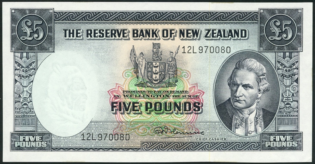 (x) Reserve Bank of New Zealand, £5 (2), ND (1961 and 1965), prefixes S4 and 12L, blue, also 10 shillings, (2), ND (1958), prefix 9B, brown, all with Captain Cook at right, arms at top centre