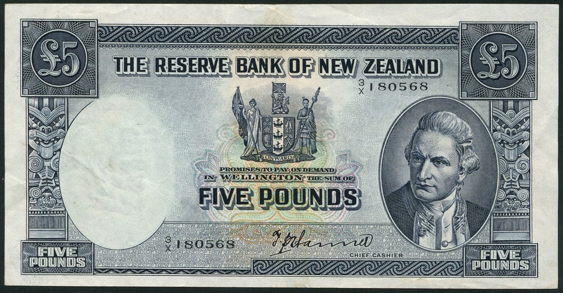 Reserve Bank of New Zealand, 10 shillings (2), brown, Fleming signature, £1 (2), violet, Hanna and Fleming signatures and £5 (3), blue, Hanna, Wilson and Fleming signatures respectively all Captain Cook at right, arms top centre
