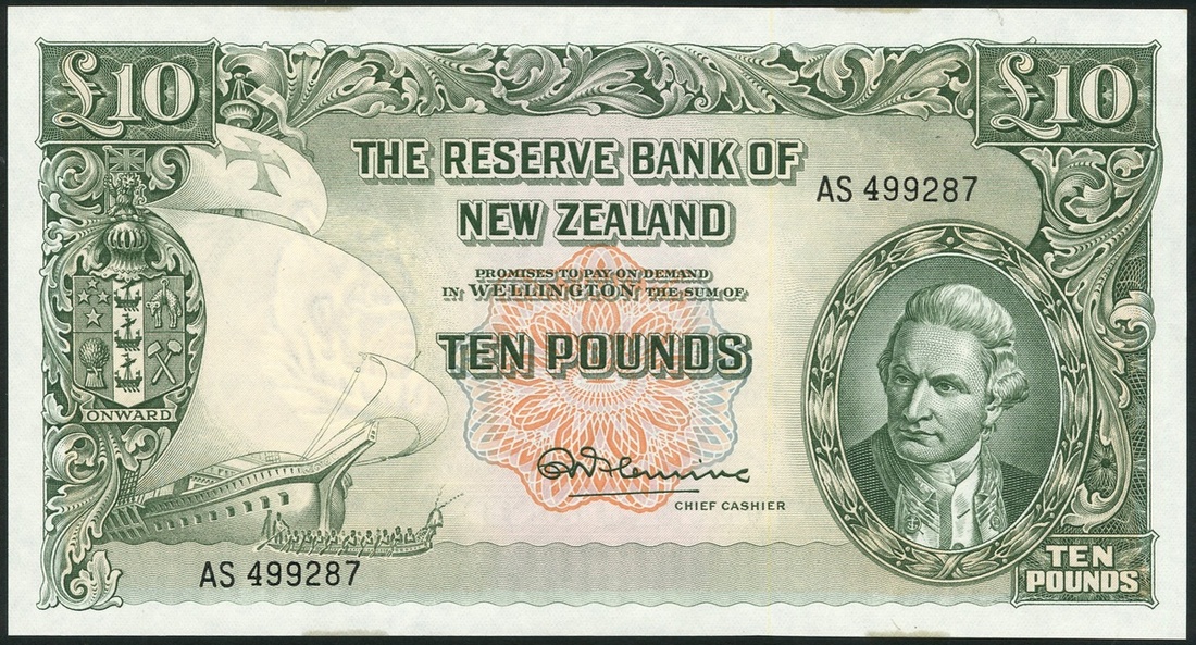Reserve Bank of New Zealand, 10 shillings, £1 and £5, ND (ca 1958-1967), all Fleming signature and Captain Cook at right