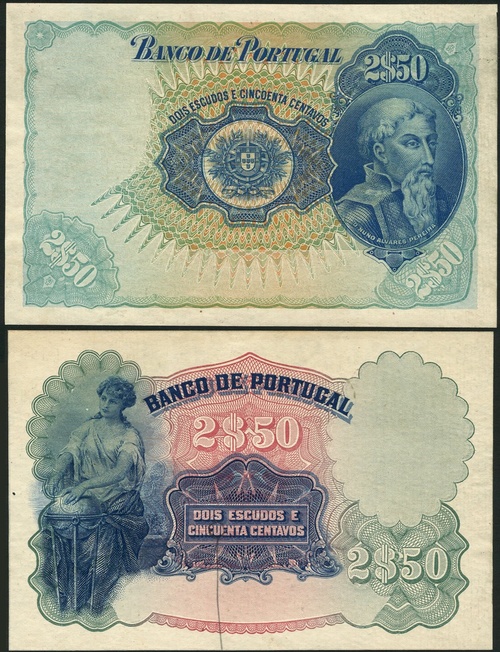 Banco de Portugal, an obverse and reverse colour trial/proof 2 and 1/2 escudos, ND (1920), blue, green and multicoloured, Pereira at right, arms at centre, reverse blue and purple, maiden and globe at left
