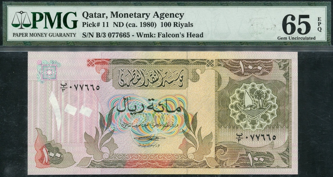 (x) Qatar Monetary Agency, 100 riyals, ND (ca 1980), serial number B/3 077665, olive green on multicolour underprint, dhow, palm trees and crossed swords at right, reverse, Qatar Monetary Agency headquarters building