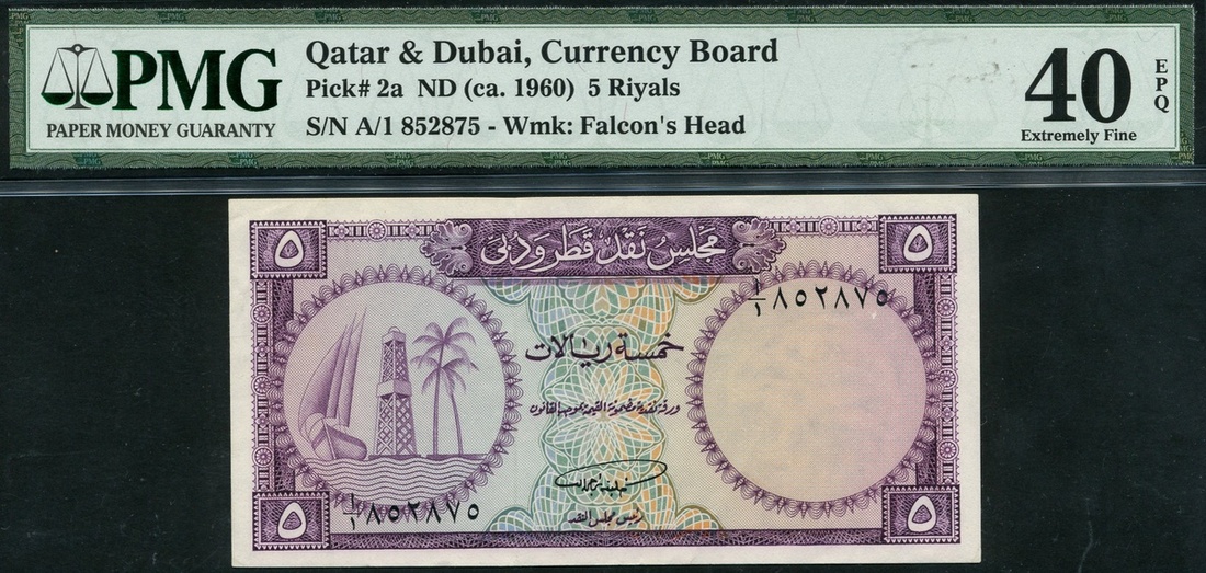 (x) Qatar & Dubai Currency Board, 5 riyals, ND (1966), serial number A/1 852875, purple on multicolour underprint, oil derrick and palm trees at left, value at each corner, Khalifa bin Hamad al-Thani signature, reverse, value at centre and top left and right