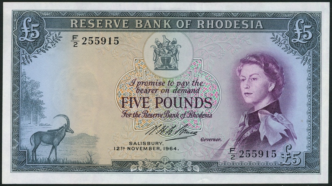 (x) Reserve Bank of Rhodesia, 10 shillings, £1, and £5, 1964, prefixes H/4, G11 and F/2, blue, red and grey-green respectively, Elizabeth II at right, arms at top centre
