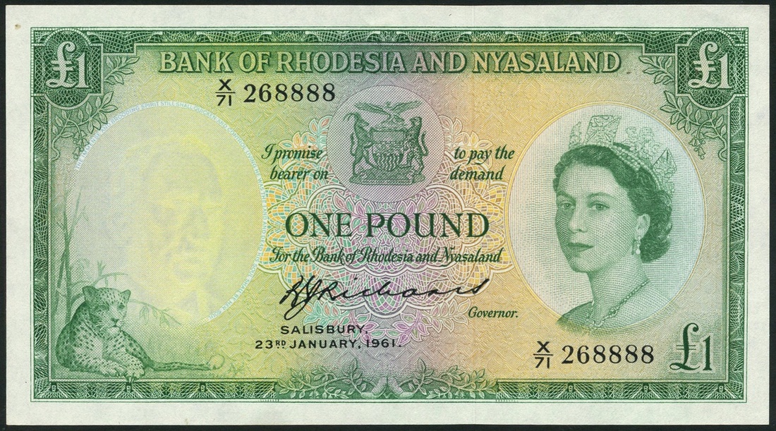 (x) Bank of Rhodesia and Nyasaland, £1, 23 January 1961, serial number X/71 268888, green on multicolour underprint, Elizabeth II at right, arms at top centre, leopard at low left