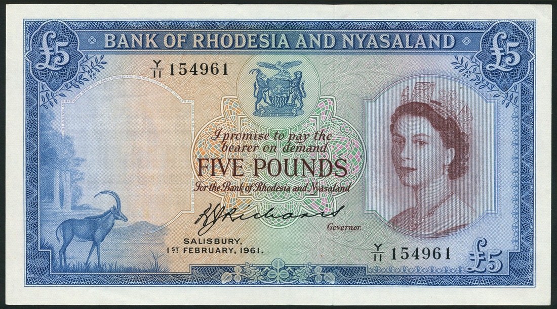 (x) Bank of Rhodesia and Nyasaland, £5, 1 February 1961, serial number Y/11 154961, blue on multicolour underprint, Elizabeth II at right, arms at top centre, Sable Antelope at low left