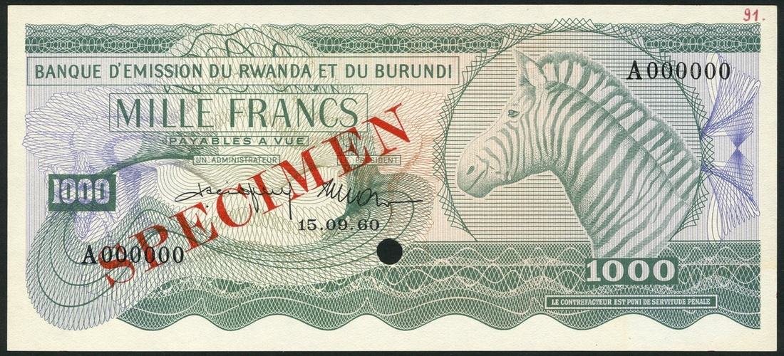 (x) Banque d'Emission du Rwanda et du Burundi, a specimen set from the 1960 issue, comprising 5 francs, orange, 10 francs, grey-blue, 20 francs, green, 50 francs, red, 100, blue, 500 francs, brown, 1000 francs, green, all with red SPECIMEN overprint, hole punched