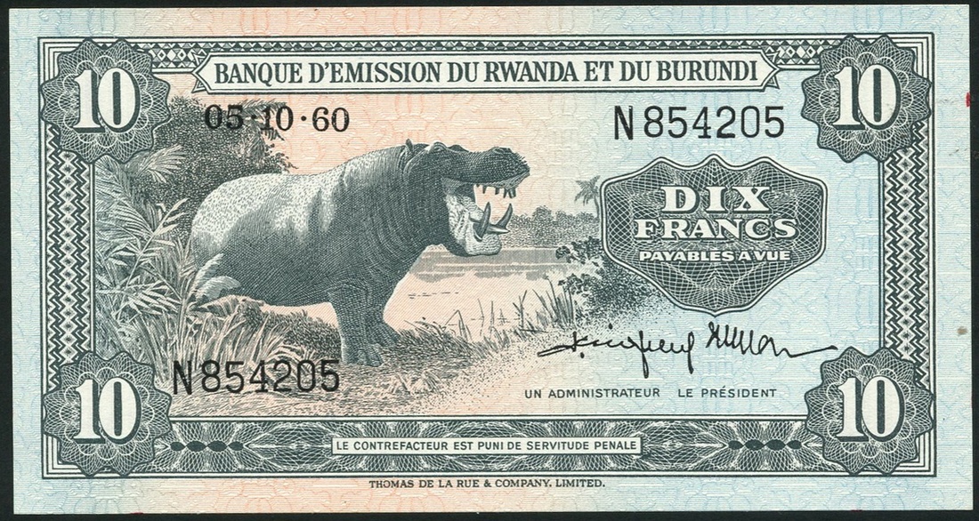 (x) Banque d'Emission du Rwanda et du Burundi, 10 francs, 15 September 1960, serial number N854205, grey-blue and pale orange, hippopotamus left centre, value in each corner and at right, reverse grey and white, value at centre