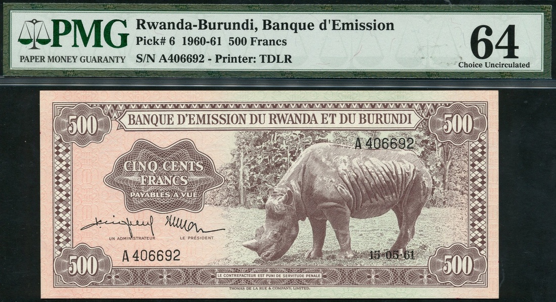 (x) Banque d'Emission du Rwanda et du Burundi, 500 francs,15 September 1960, serial number A 406692, brown, lilac and green, Rhinoceros at right, value at left and at each corner, reverse brown and white, guilloche patterns, value at centre and four corners