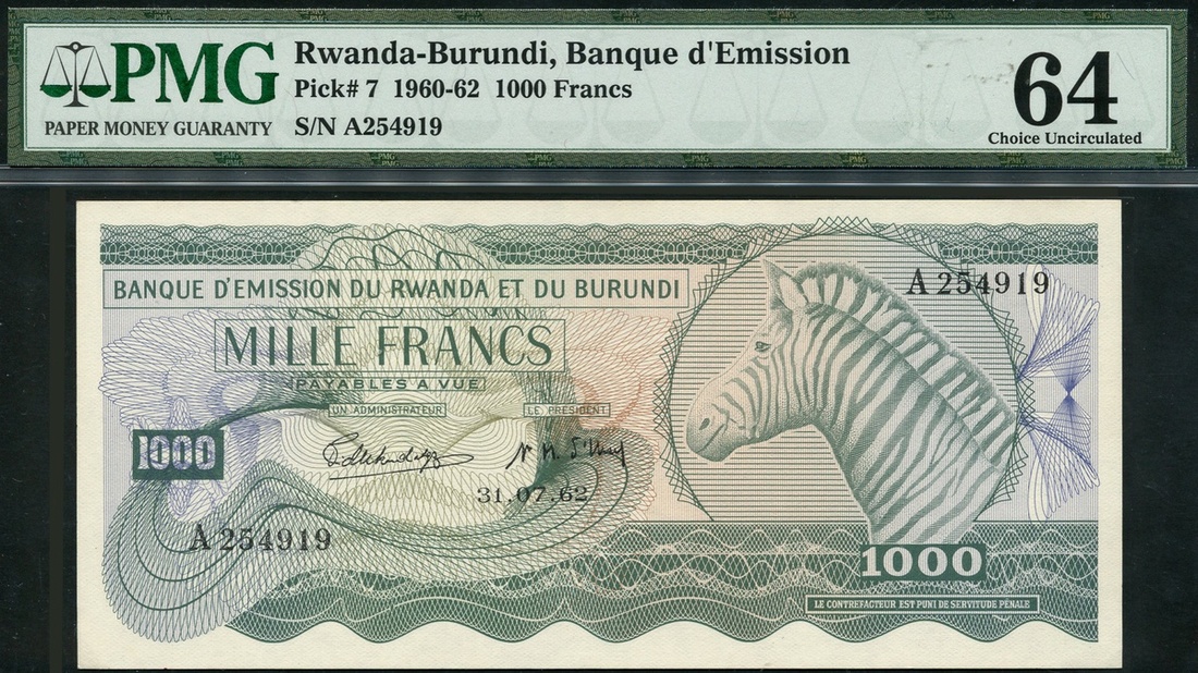 (x) Banque d'Emission du Rwanda et du Burundi, 1000 Francs, 31 July 1962, serial number A254919 green on multicoloured underprint, zebra at right, value at left and lower right, reverse value repeated three times set in ornate geometric patterns,