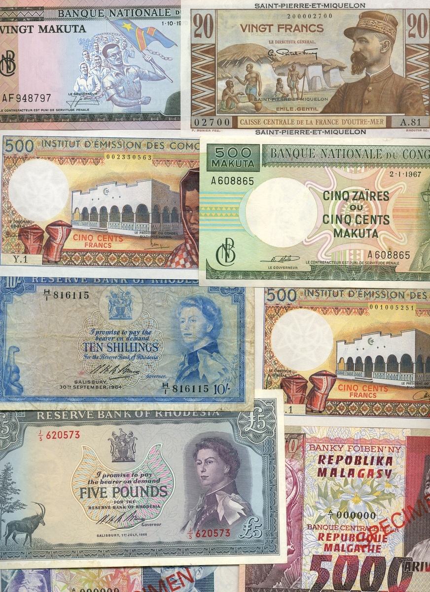 (x) A group of world notes comprising Comoros 500 francs (2), Congo 20 makuta and 500 makuta, Rhodesia 10 shillings, 1964 and £5, 1966, Saint Pierre and Miquelon 20 francs and Madagascar specimen 1000 and 5000 francs