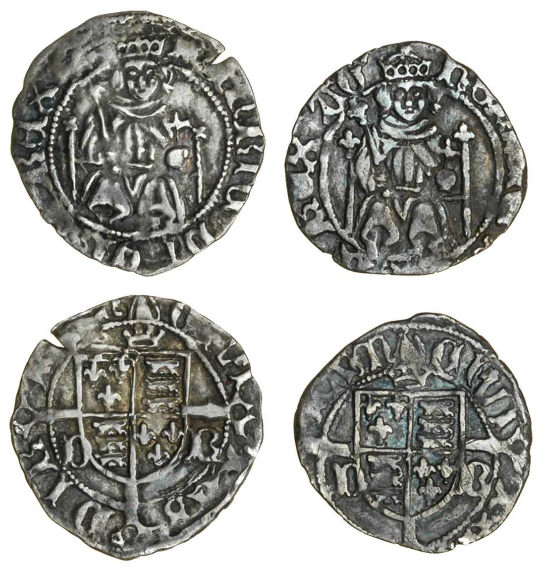 Henry VII (1485-1509), Pennies (2), Durham under Bishop Fox, both Sovereign type IIIb, 0.67g, m.m. none, henric di gra rex a, king seated on throne, two saltire-topped pillars, rev. civi tas dir ham, mitre above, d r by shield; 0.67g, rex ag, two lis-topped pillars (N.1731; S.2234; Stewartby p.448, the first pl.31/556 this coin), very fine, the first very rare (2)