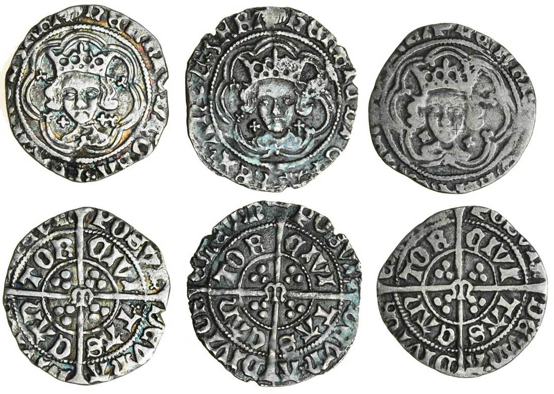 Henry VII (1485-1509), Halfgroats (3), Canterbury under Archbishop Morton, type IB, 1.50g, m.m. tun/-, henric di gra rex angl z fra, facing bust, open crown, trefoil stops both sides and on cusps, crosses by neck, rev. posvi dev adivtore mevm, civi tas can tor, m at centre; type I/IIa mule, 1.43g, m.m. tun, obv. as previous, rev. eye after posvi, saltire after devm, m at centre; and another, 1.24g, as previous but pellet after devm (N.1710, 1710/1711 (2); S.2207, 2207/2208 (2); Stewartby p.440-1), the first two toned, very fine, slightly better in parts, the last only fine but the variety clear and unrecorded by Lord Stewartby, all rare (3)