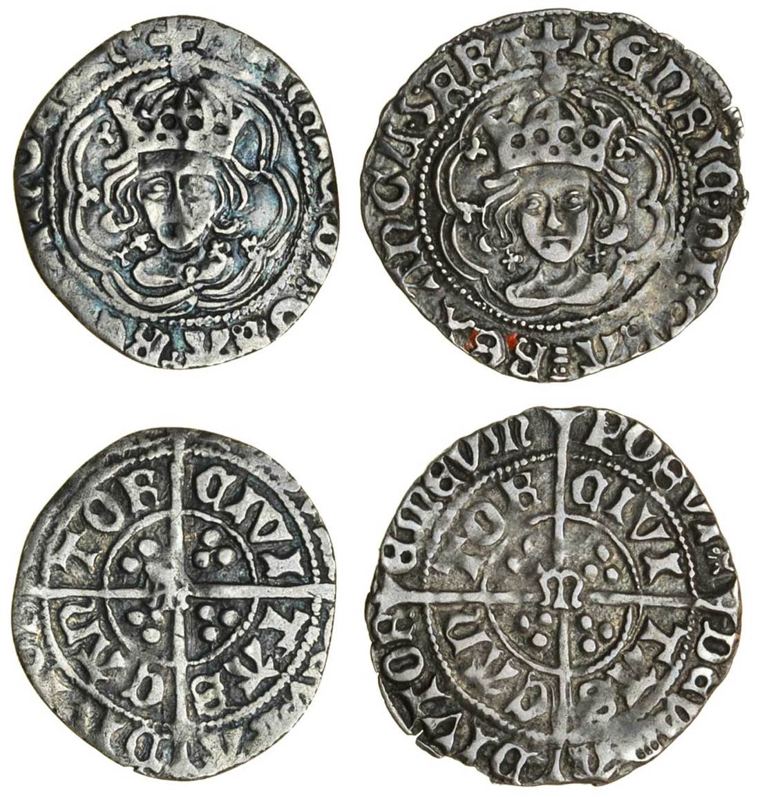 Henry VII (1485-1509), Halfgroats (2), Canterbury under Archbishop Morton, type IIb/a, 1.23g, m.m. tun/-, henric di gra rex angl z fr, facing bust, double arched crown, trefoil stops and on cusps, crosses by neck, rev. posvi dev adivtore mevm, eye after posvi, civi tas can tor, m at centre; type IIa, 1.61g, m.m. none, z fra, pellet stops, tun after gra, rev. eye after posvi, m at centre (N.1711; S.2208; Stewartby p.441, the second pl.29/502 this coin), the first clipped, good fine, the second toned, a bold very fine, rare (2)