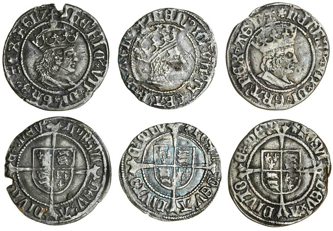 Henry VII (1485-1509), Halfgroats (3), Canterbury, King and Archbishop Warham jointly, type Va/b mule, 1.36g, m.m. martlet, he’ric9 vii di gra rex agl z, saltire stops, profile bust right, rev. posvi dev adivtore mev, saltire stops; type Vb/ci mule, 1.23g, m.m. martlet/rose, henric, rev. no stops; type Vcii, 1.36g, m.m. rose, henric9 vii di gra rex agl, saltire stops, rev. adivtoe, saltire stops (N.1750; S.2261; Stewartby p.442), the first scratched and chipped, the second scuffed, otherwise good fine to very fine, the second rare (3)