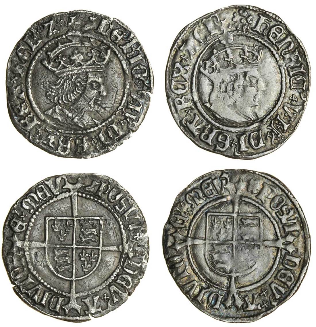 Henry VII (1485-1509), Halfgroats (2), Canterbury, King and Archbishop Warham jointly, type Va/b mule, 1.51g, m.m. martlet, he’ric9 vii di gra rex agl z, saltire stops, profile bust right, rev. posvi dev adivtore mev, saltire stops; type Vcii, 1.41g, m.m. large rose/small rose, henric9 vii9 di gra rex agl, rev. adivtoe, saltire stops (N.1750; S.2261; Stewartby p.442), the first with surface marks, otherwise good fine to very fine, both rare (2)