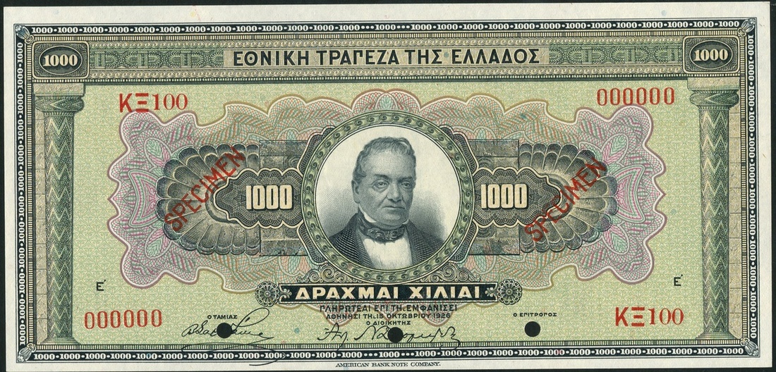 (x) Bank of Greece, Provisional issue, specimen 1000 drachmai, 15 October 1926, red serial number 000000, black, pale green and lilac, George Stavros at centre, value at left and right, column at left and right, red BANK OF GREECE overprint, three signatures below, one with red block overstamp, reverse blue-grey, stone carving at centre, value at left and right and at each corner