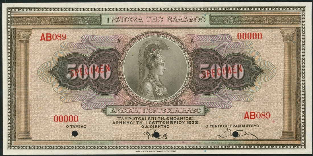(x) Bank of Greece, Provisional issue, specimen 5000 drachmai, 1 September 1932, red serial number AB089 00000, brown and pink, head of Athena at centre, value at left and right, three signatures below, blue, pale yellow and lilac, mythical bird at centre, value at left and right