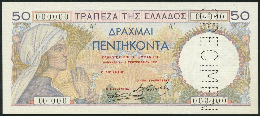 (x) Bank of Greece, specimen 50 drachmai, 1 September 1935, zero serial numbers, multicoloured, girl with corn sheaf at left, floral background, reverse multicoloured, Victory at right, classical frieze at centre