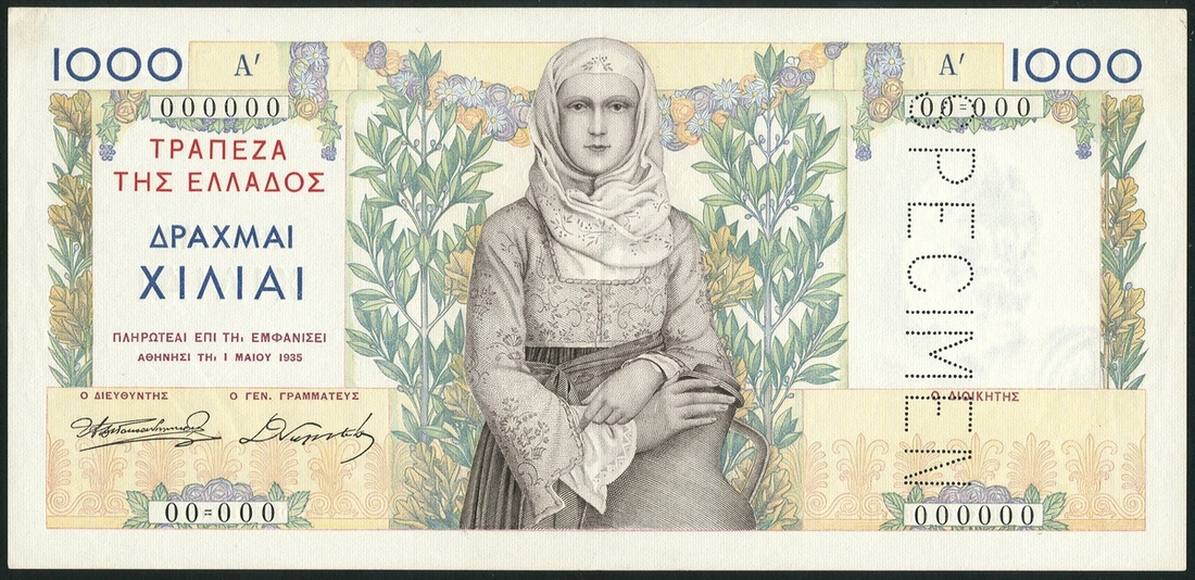 (x) Bank of Greece, specimen 1000 drachmai, 1 September 1935, zero serial numbers, multicoloured, girl with pithos at centre, floral background, reverse multicoloured, woman at centre with pithos, allegorical scenes of industry at left and right
