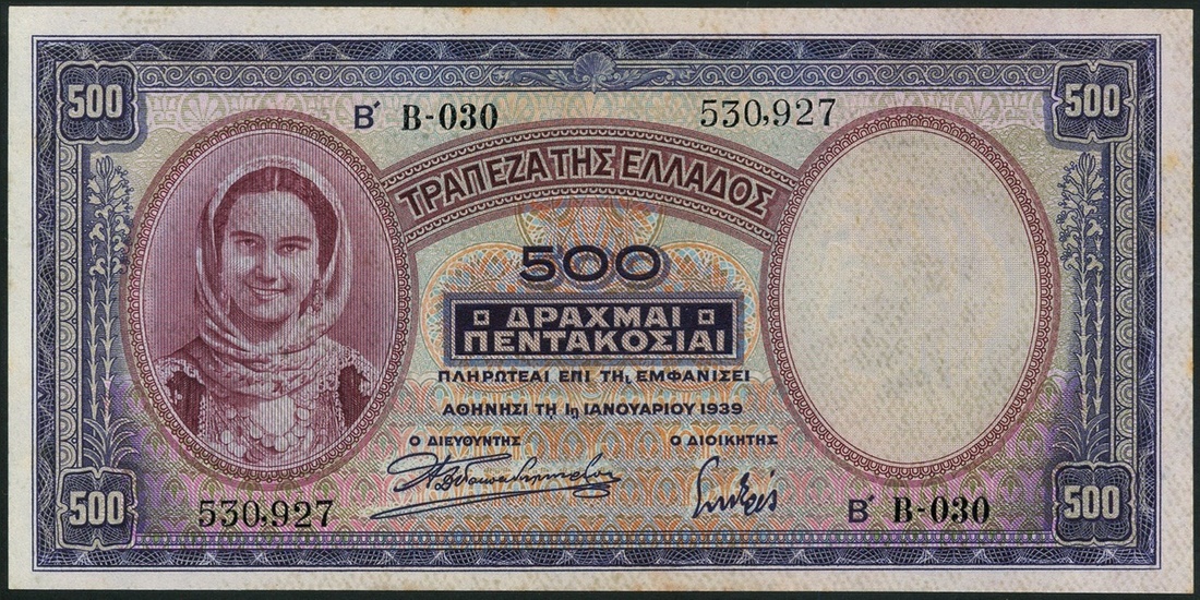(x) Bank of Greece, specimen 500 drachmai, 1 January 1939, serial number A-040 000000, blue and multicoloured, girl at left, also three issued example, two of them consecutive, the single note with ENI error