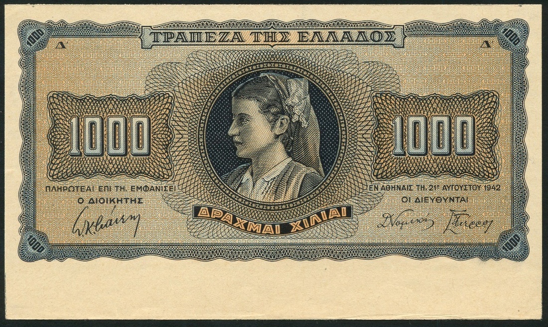 (x) Bank of Greece, Emergency World war II issue, 1000 drachmai (8), 1942, blue, brown and pale orange, girl at centre, one large format paper and no serial numbers, one miscut at low margin, also 5000 drachmai (6), 1942, one a specimen with serial number in red 000000, brown and pale pink-orange, the Nike of Samothrace at centre, also 10000 drachmai (3), 1942, brown and pale blue, young farm couple at left
