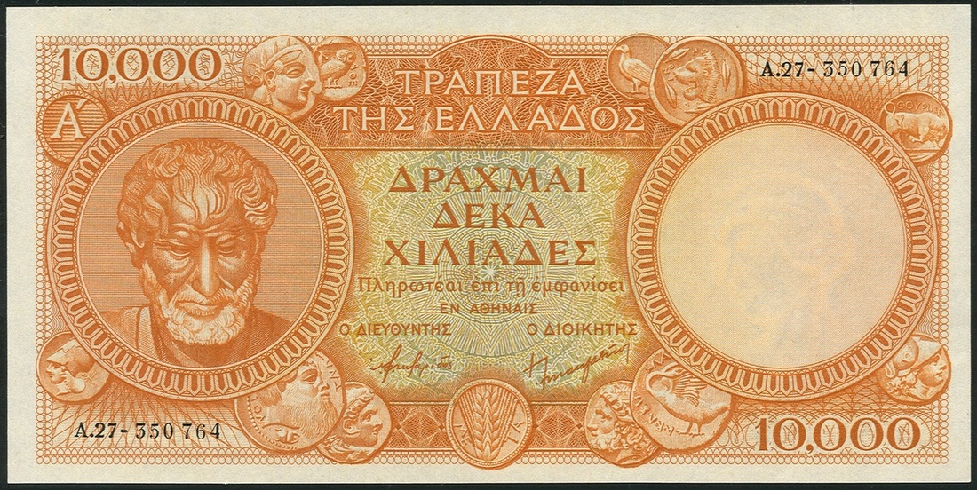 (x) Bank of Greece, Post World War II, 10000 drachmai, ND (1945), serial number A.27 350764, orange and pale green, Aristotle at left, classical coins around borders, reverse orange, charioteer at centre