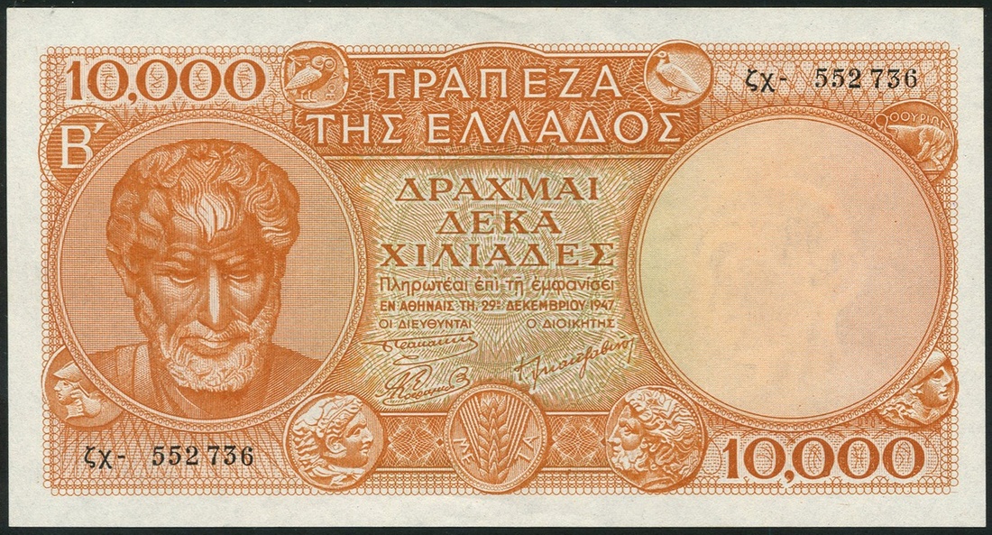 (x) Bank of Greece, 10000 drachmai (3), 29 December 1947, serial numbers 590975, 340147 and 552736, orange and pale green, Aristotle at left, classical coins in borders, reverse orange, charioteer at centre