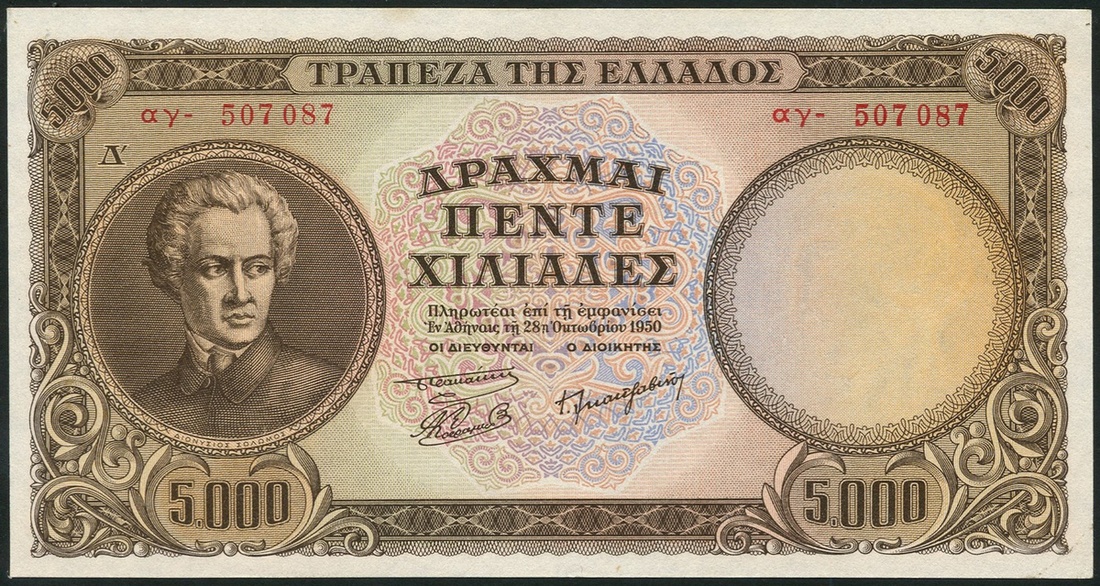 (x) Bank of Greece, 5000 drachmai, 28 October 1950, serial number 507087, brown and multicoloured, Solomos at left, reverse brown, the battle of Mesolonghi and 50000 drachmai (2), 1950, serial numbers 548843 and 636193, green, woman at left