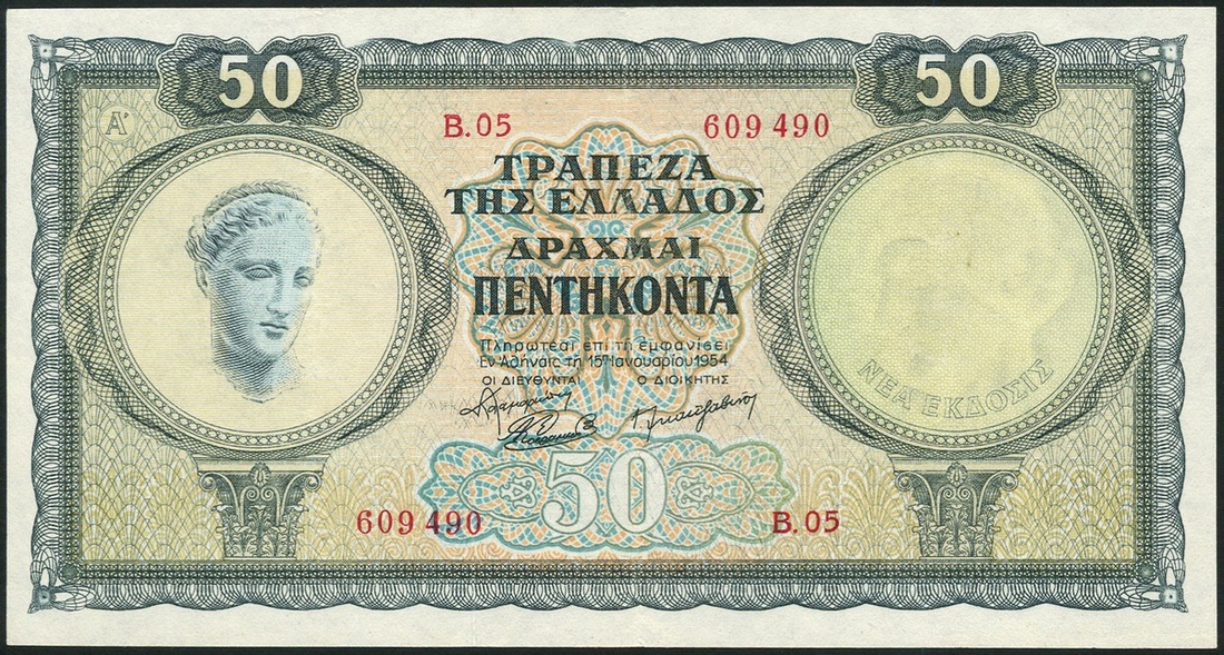 (x) Bank of Greece, specimen 50 drachmai, 1954, red serial number A.07 000000, green and multicoloured, woman at left, reverse grey-green, ruins