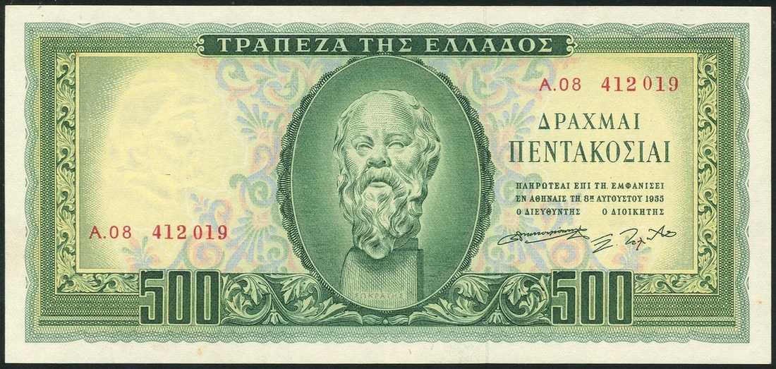 (x) Bank of Greece, 50 drachmai, 1955, green, 100 drachmai, 1954, red and 500 drachmai, 1955, green