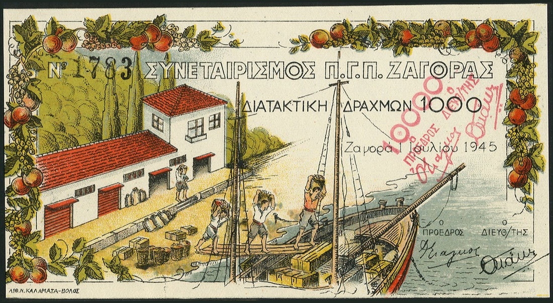 (x) Co-Operative Credit notes of Zagora, a set comprising 100,500,1000,10000 and 50000 drachmai, 1945, all are red and multicoloured, boat loading at quayside, the last two with red value handstamp