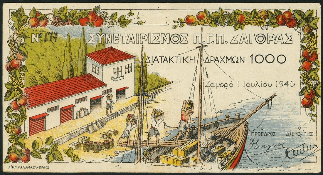 (x) Co-Operative Credit notes of Zagora, a set comprising 100, 500 and 1000 drachmai, 1945, all are red and multicoloured, boat loading at quayside, no handstamps on obverse or reverse, first manuscript number 338, second manuscript 127, third manuscript 177
