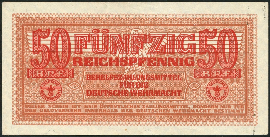 (x) Auxiliary Payment Certificates, German Occupation during World War II, a set comprising 1 reichspfennig, blue, 5 reichspfennig, 10 reichspfennig, green, 50 reichspfennig, red-orange, all have circular red Greek handstamp and circular purple German handstamp, all valid 15 October -30 October 1944