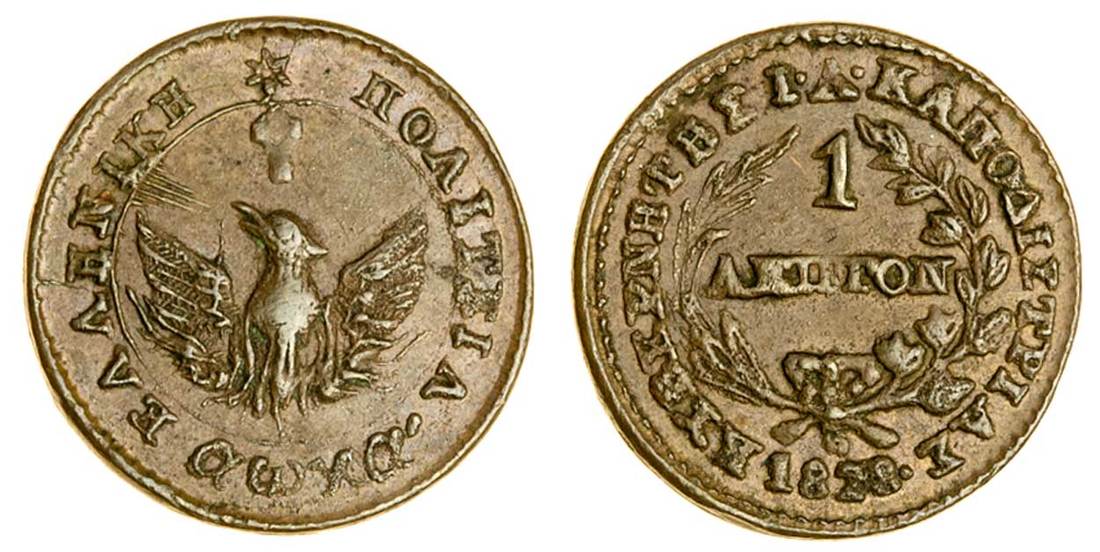 (x) John Capodistrias (1828-31), Lepton, 1828, mint of Aegina, phoenix in wire line circle, Greek date (1821 - the first year of the rebellion), below, rev. value in wreath, date 1828 below (Divo 7; KM 1), PCGS MS 63 BN