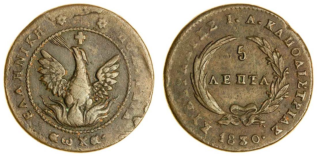 (x) John Capodistrias (1828-31), 5-Lepta, 1830, mint of Aegina, phoenix in chevron circle, Greek date below, rev. value in wreath, date below (Divo 5a; KM 6), nearly very fine