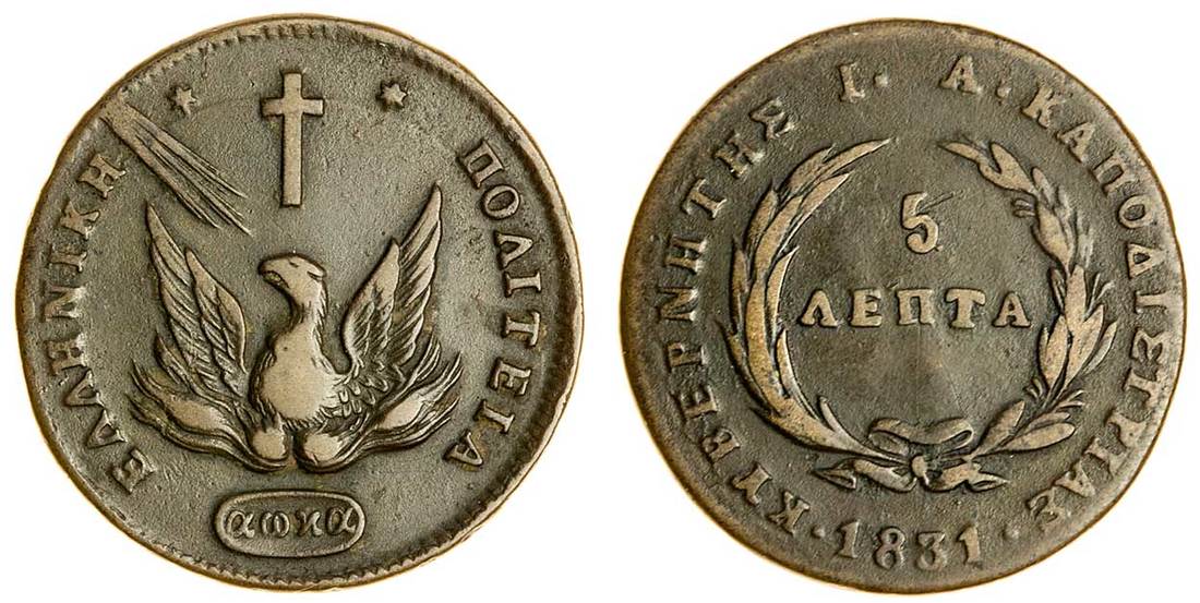 (x) John Capodistrias (1828-31), 5-Lepta, 1831, mint of Aegina, phoenix, no inner circle, Greek date in cartouche below, rev. value in wreath, date below (Divo 6; KM 10), good very fine