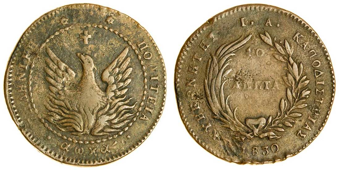 (x) John Capodistrias (1828-31), 10-Lepta, 1830, mint of Aegina, phoenix in pearl circle, Greek date below, rev. value in wreath, date below (Divo 3a; KM 8), good fine